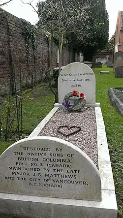 Vancouver's grave is in the churchyard of St Peter's Church, Petersham, in the London Borough of Richmond upon Thames, England. The Hudson's Bay Company placed a memorial plaque in the church in 1841.[20] His grave in Portland stone, renovated in the 1960s, is now Grade II listed in view of its historical associations.[20][21]
