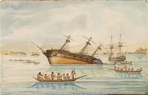 Vancouver generally established a rapport with both Indigenous peoples and European trappers. Historical records show that Vancouver enjoyed good relations with native leaders—in Hawaii with King Kamehameha I, as well as in the Pacific Northwest and California.[26] Vancouver's journals exhibit a high degree of sensitivity to the indigenous populations he encountered. He wrote of meeting the Chumash people,[15] and of his exploration of a small island on the Californian coast on which an important burial site was marked by a sepulchre of "peculiar character" lined with boards and fragments of military instruments lying near a square box covered with mats.[26] Vancouver states: