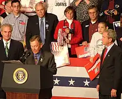 Voinovich gained national attention when he gave a speech tearfully opposing President George W. Bush's nomination of John Bolton for U.S. Ambassador to the United Nations at Bolton's hearing in front of the Senate Foreign Relations Committee. Voinovich remarked, "I don't feel comfortable voting today on Mr. John Bolton." As a result, the committee recessed without a vote, stalling the nomination.[37] Democrats refused to invoke cloture and end debate on the nomination; the first time, Voinovich voted to end debate, but the second time he joined Democrats in voting to extend debate and urged Bush to choose another nominee.