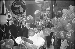 For the fall 1964 elections, Romney cut himself off from the national ticket, refusing to even appear on the same stage with them[147] and continuing to feud with Goldwater privately.[25] He campaigned for governor in mostly Democratic areas, and when pressed at campaign appearances about whether he supported Goldwater, he replied, "You know darn well I'm not!"[148] Romney was re-elected in 1964 by a margin of over 380,000 votes over Democratic Congressman Neil Staebler, despite Goldwater's landslide defeat to President Lyndon B. Johnson that swept away many other Republican candidates.[96][149][150] Romney won 15 percent of Michigan's black vote, compared to Goldwater's two percent.[96]