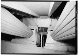 Construction of the approaches started in September 1958.[189] Work on the lower level itself started on June 2, 1959,[141] but work was briefly halted later that year because of a lack of steel.[203] By February 1960, construction was underway on the lower level; the supporting steelwork for the future deck had been completed, and the sections for the lower deck were being installed.[200] The George Washington Bridge's lower deck would comprise 75 steel slabs; each slab weighed 220 tons and measured 108 feet (33 m) wide by 90 feet (27 m) feet long, with a thickness of 30 feet (9.1 m). The construction of the slabs proceeded from either side of the bridge.[189] The right-of-way for the George Washington Bridge Expressway had been almost entirely cleared except for the ventilation buildings for the 178th–179th Street Tunnels.[200] The segments of the lower deck had been laid completely by September 1960, at which point workers started pouring the concrete for the deck's roadway, a process that took five weeks.[204] The layer of concrete measured 4 inches (10 cm) thick.[189] Finally, the deck was paved over with a 2.5-inch (6.4 cm) layer of asphalt.[205][189]