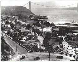 In April, the Port Authority acquired the last of the properties that were in the path of the bridge's Manhattan approach.[126] Plans for the Manhattan approach were approved by the New York City Board of Estimate around the same time. The approach was to consist of scenic, meandering ramps leading to both Riverside Drive and the Henry Hudson Parkway, which run along the eastern bank of the Hudson River at the bottom of the cliff in Washington Heights. The bridge would also connect to 178th and 179th Streets, at the top of Washington Heights. A third connection would be made to an underground highway running between and parallel to 178th and 179th Streets; this connection would become the 178th–179th Street Tunnels, and would later be replaced by the Trans-Manhattan Expressway.[127] The original plan for the approach to the underground highway stated that the approach would be made using a monumental stone viaduct descending from the span at a 2.2% gradient.[116] The Port Authority started evicting residents in the approach's path in October 1929.[128] The same month, the Port Authority sold the final $30 million in bonds to pay for the bridge.[129]