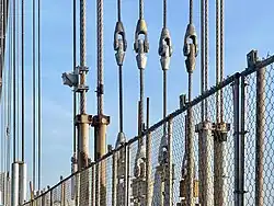 Four 3-foot (0.91 m)-diameter main cables support the bridge deck.[11] Each main cable contained 61 strands of wire rope, with each strand made of 434 individual wires, for a total of 26,474 wires per main cable, and 105,986 in all. The cables are covered by a sheath of weather-resistant steel.[40][41][42] The upper bridge deck is held by vertical suspender cables attached directly to the main cables by saddle connections; the lower deck is supported by girders attached to the upper.[43][44][45] There are 592 suspender cables, which are 38 to 674 feet (12 to 205 m) long.[46]