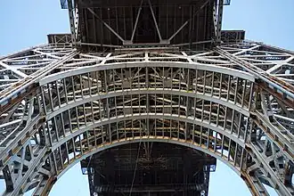 The suspension towers on each side of the river are each 604 feet (184 m) tall.[1] They are composed of sections weighing between 37 and 40 short tons (33 and 36 long tons) and contain a combined 475,000 rivets.[50] Each bridge has two archways, one above and one below the decks.[11] The George Washington Bridge is classified as a fracture critical bridge, making it vulnerable to collapse if parts of the towers were to fail, although the towers are located offshore.[51]