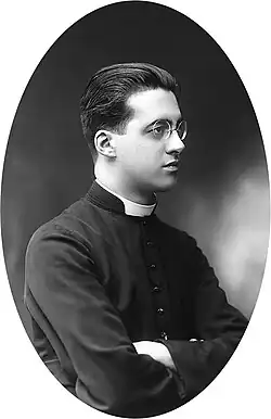 Lemaître had considered joining the Jesuits or the Benedictines, but finally decided to prepare instead for the diocesan priesthood.[21] Between 1920 and 1923 he was a student at the Maison Saint-Rombaut, the seminary for "late vocations" (i.e., mature students for the priesthood) of the Archdiocese of Mechelen. It was during his spare time at the seminary that Lemaître learned the general theory of relativity. He was ordained as a priest on 22 September 1923 by Cardinal Mercier.[22][23] As a diocesan priest in French-speaking Belgium, he was known as "Abbé Lemaître".