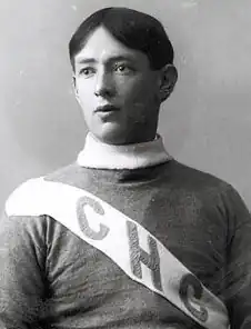 Georges, the fifth of eight children, was born on January 21, 1887, in Chicoutimi, Quebec, to Georges-Henri Vézina, a local baker and his wife Clara Belley.[1] Georges attended school at the Petit Séminaire de Chicoutimi from 1898 until the age of fourteen, when he left the school to help at his father's bakery.[2][3] He played hockey from a young age, participating in informal street hockey matches with others his own age.[4] Vézina partook in these matches in his shoes, and used skates for the first time at age 16 when he joined the local team in Chicoutimi.[5] As Chicoutimi was in a remote area of Quebec, more than 200 kilometres from Quebec City, the hockey club was not in any organised league. Rather the club, known as the Saguenéens ("People from the Saguenay", the region where Chicoutimi is located), toured the province, playing exhibition games against a variety of clubs.[4]