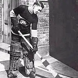 On February 17, 1910, the Chicoutimi Hockey Club played an exhibition match against the Montreal Canadiens.[5] Though playing an inferior team the Canadiens failed to score a goal, losing the game. This prompted Joseph Cattarinich, goaltender for the Canadiens, to convince his team to offer a tryout to Georges Vézina, who was Chicoutimi's goaltender.[10] Vézina initially refused the offer, staying in Chicoutimi until the Canadiens returned in December of that year. This time they convinced Georges, along with his brother Pierre, to come to Montreal. The two Vézina brothers arrived on December 22, 1910.[4] While Pierre failed to make the team, Georges impressed the Canadiens, especially with the use of his stick to block shots.[11] Vézina was signed to a contract for C$800 per season,[3][5] and made his professional debut December 31, 1910, against the Ottawa Senators.[4] He would play all 16 games for the Canadiens in the 1910–11 season, finishing with a record of eight wins and eight losses, while allowing the fewest goals in the league.