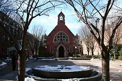 The main campus is just over 102 acres (41 ha) in area and includes 58 buildings, student residences capable of accommodating 80 percent of undergraduates, various athletic facilities, and the medical school.[39] Most buildings employ collegiate Gothic architecture and Georgian brick architecture. Campus green areas include fountains, a cemetery, large clusters of flowers, groves of trees, and open quadrangles.[40] The main campus has traditionally centered on Dahlgren Quadrangle, although Red Square has replaced it as the focus of student life.[41] Healy Hall, built in Flemish Romanesque style from 1877 to 1879, is the architectural gem of Georgetown's campus, and is a National Historic Landmark.[42]