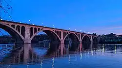 Georgetown's transportation importance was defined by its location just below the fall line of the Potomac River. The Aqueduct Bridge (and later, the Francis Scott Key Bridge) connected Georgetown with Virginia. Before the Aqueduct Bridge was built, a ferry service owned by John Mason connected Georgetown to Virginia.[47] In 1788, a bridge was constructed over Rock Creek to connect Bridge Street (M Street) with the Federal City.[48]