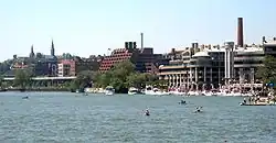 The primary commercial corridors of Georgetown are M Street and Wisconsin Avenue, whose high fashion stores draw large numbers of tourists as well as local shoppers year-round. There is also the Washington Harbour complex on K Street, on the waterfront, featuring outdoor bars and restaurants popular for viewing boat races. Between M and K Streets runs the historic Chesapeake and Ohio Canal, today plied only by tour boats; adjacent trails are popular with joggers or strollers.