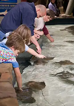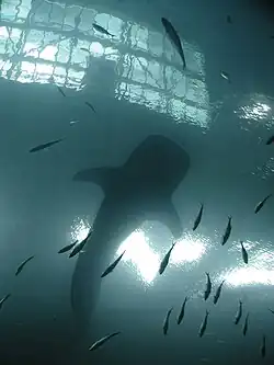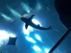 The aquarium's notable specimens include whale sharks, beluga whales, California sea lions, bottlenose dolphins, manta rays, sea otters, and tiger sharks.[5][6] Its centerpiece is a 6.3 million US gallons (24,000 m3) whale shark exhibit.[7][3]