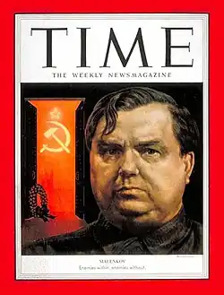 During the same years, Malenkov also exterminated the Jewish Anti-Fascist Committee. Many members of the Jewish Anti-Fascist Committee were killed in the Night of the Murdered Poets. On 12 August 1952, thirteen Jewish writers were executed for treason in the basement of Lubyanka Prison.[18] This was approved by Stalin and supervised by Malenkov.[17] 1952 and 1953 Time magazine covers indicate that Malenkov was generally considered to be Stalin's apprentice and successor.[19]