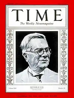 Machado was elected president in 1924 as the leader of the Liberal Party, a moderate reform-oriented party.[1] He entered the presidency with widespread popularity and support from the major political parties. However, his support declined over time and Machado took dictatorial powers.[2][3][4][5] Despite promising to govern only for one term, he ran for re-election in 1928 and won a non-democratic election where the opposition was repressed.[6] As protests and rebellions became more strident, his administration curtailed free speech and imprisoned, exiled, and murdered Machado's opponents.[4]
