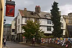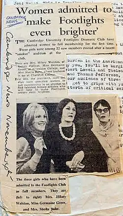 As soon as she arrived, Greer auditioned (with Clive James, whom she knew from the Sydney Push) for the student acting company, the Footlights, in its club room in Falcon Yard above a Mac Fisheries shop. They performed a sketch in which he was Noël Coward and she was Gertrude Lawrence.[48] Joining on the same day as James and Russell Davies,[49] Greer was one of the first women to be admitted as a full member, along with Sheila Buhr and Hilary Walston.[d] The Cambridge News carried a news item about it in November 1964, referring to the women as "three girls".[52] Greer's response to being accepted was reportedly: "This place is jumping with freckle-punchers. You can have it on your own."[53] She did take part in its 1965 revue, My Girl Herbert,[50] alongside Eric Idle (the Footlights president), John Cameron, Christie Davies and John Grillo.[54] A critic noticed "an Australian girl who had a natural ability to project her voice".[55] Other members of the Footlights when she was there included Tim Brooke-Taylor, John Cleese, Peter Cook and David Frost.[56]