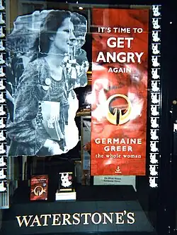 Launched at a party attended by editors from Oz,[103] The Female Eunuch was published in the UK by MacGibbon & Kee on 12 October 1970,[104] dedicated to Lillian Roxon and four other women.[105] The first print run of 2+1⁄2 thousand copies sold out on the first day.[106] Arguing that the suburban, consumerist, nuclear family represses and devitalizes women, the book became an international bestseller and a watershed text in the feminist movement.[5] According to Greer, McGraw-Hill paid $29,000 for the American rights and Bantam $135,000 for the paperback.[86] The Bantam edition called Greer the "Saucy feminist that even men like", quoting Life magazine, and the book "#1: the ultimate word on sexual freedom".[107] Demand was such when it was first published that it had to be reprinted monthly,[108] and it has never been out of print.[3] Wallace writes about one woman who wrapped it in brown paper and kept it hidden under her shoes, because her husband would not let her read it.[109] By 1998 it had sold over one million copies in the UK alone.[110]