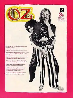 Greer began writing columns as "Dr. G" for Oz magazine, owned by Richard Neville, whom she had met at a party in Sydney.[74] The Australian Oz had been shut down in 1963 after three months and the editors convicted of obscenity, later overturned. Neville and his co-editor, Martin Sharp, moved to London and set up Oz there. When Neville met Greer again, he suggested she write for it, which led to her article in the first edition in 1967, "In Bed with the English".[75] Keith Morris photographed her ("Dr G, the only groupie with a PhD in captivity") for issue 19 in early 1969; the black-and-white images include one of her posing for the cover with Vivian Stanshall and another in which she pretends to play the guitar.[76] The July 1970 edition, OZ 29, featured "Germaine Greer knits private parts", an article from Oz's Needlework Correspondent on the hand-knitted Keep it Warm Cock Sock, "a snug corner for a chilly prick".[77] As "Rose Blight", she also wrote a gardening column for Private Eye.[78]