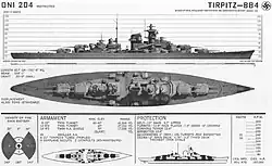 ![]() A recognition drawing of Tirpitz prepared by the US Navy | |