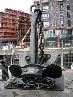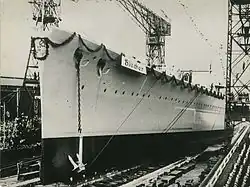 Blücher was ordered by the Kriegsmarine from the Deutsche Werke shipyard in Kiel.[4] Her keel was laid down on 15 August 1935,[9] under construction number 246.[4] The ship was launched on 8 June 1937, and was completed slightly over two years later, on 20 September 1939, the day she was commissioned into the German fleet.[10] The commanding admiral of the Marinestation der Ostsee (Baltic Naval Station), Admiral Conrad Albrecht, gave the christening speech. Mrs. Erdmann, widow of Fregattenkapitän (Frigate Captain) Alexander Erdmann, former commander of SMS Blücher who had died in the ship's sinking, performed the christening.[11] As built, the ship had a straight stem, though after her launch this was replaced with a clipper bow increasing the overall length to 205.90 meters (675.5 ft).[3] A raked funnel cap was also installed.[12]