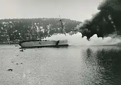 After passing the gun batteries, the crew, including the personnel manning the guns, were tasked with fighting the fire. By that time she had taken on a list of 18 degrees, although this was not initially problematic. The fire eventually reached one of the ship's 10.5 cm ammunition magazines between turbine room 1 and turbine room 2/3, which exploded violently. The blast ruptured several bulkheads in the engine rooms and ignited the ship's fuel stores. The battered ship slowly began to capsize and the order to abandon ship was given.[29] Blücher rolled over and sank at 07:30, with significant casualties.[30] Naval historian Erich Gröner states that the number of casualties is unknown,[10] and Henrik Lunde gives a loss of life figure ranging between 600 and 1,000 soldiers and sailors.[19] Jürgen Rohwer meanwhile states that 125 seamen and 195 soldiers died in the sinking.[31]