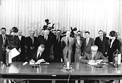 In the wake of that resolution of accession, the "German reunification treaty",[45][46][47] commonly known in German as "Einigungsvertrag" (Unification Treaty) or "Wiedervereinigungsvertrag" (Reunification Treaty), that had been negotiated between the two German states since 2 July 1990, was signed by representatives of the two governments on 31 August 1990. This Treaty, officially titled Vertrag zwischen der Bundesrepublik Deutschland und der Deutschen Demokratischen Republik über die Herstellung der Einheit Deutschlands (Treaty between the Federal Republic of Germany and the German Democratic Republic on the Establishment of German Unity), was approved by large majorities in the legislative chambers of both countries on 20 September 1990 (440–47 in the West German Bundestag and 299–80 in the East German Volkskammer).[48] The Treaty passed the West German Bundesrat on the following day, 21 September 1990. The amendments to the Federal Republic's Basic Law that were foreseen in the Unification Treaty or necessary for its implementation were adopted by the Federal Statute of 23 September 1990, that enacted the incorporation of the Treaty as part of the Law of the Federal Republic of Germany. The said Federal Statute, containing the whole text of the Treaty and its Protocols as an annex, was published in the Bundesgesetzblatt (the official journal for the publication of the laws of the Federal Republic) on 28 September 1990.[49] In the German Democratic Republic, the constitutional law (Verfassungsgesetz) giving effect to the Treaty was also published on 28 September 1990.[44] With the adoption of the Treaty as part of its Constitution, East Germany legislated its own abolition as a separate state.