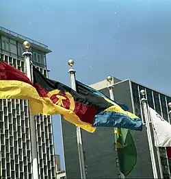 The Western Allies and West Germany rejected the Soviet Union's idea of neutral reunification in 1952, resulting in the two German governments continuing to exist side-by-side. Most of the border between two Germanies, and later the border in Berlin, were physically fortified and tightly controlled by East Germany from 1952 and 1961, respectively. The flags of the two German countries were originally the same, but in 1959 East Germany changed its flag.[25] The West German government initially did not recognize the new and de facto German–Polish border, nor East Germany, but later eventually recognized the border in 1972 (with the 1970 Treaty of Warsaw[26][27][28]) and East Germany in 1973 (with the 1972 Basic Treaty[29]) when applying a common policy to reconcile with the communist countries in the East. The East German government also had encouraged two-state status after initially denying the existence of the West German state, influenced by the Soviet policy of "peaceful coexistence". The mutual recognition of the two Germanies paved the way for both countries to be widely recognized internationally.[c] The two Germanies joined the United Nations as two separate country members in 1973 and East Germany abandoned its goal of reunification with their compatriots in the West in a constitutional amendment the following year.