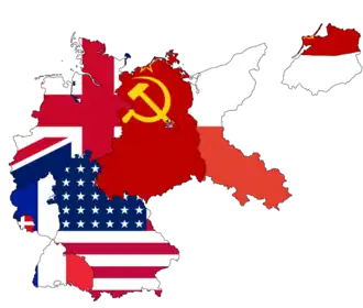 Among the Allies, geo-political tension between the Soviet Union and Western Allies in occupied Germany as part of their tension in the world led the Soviets to de facto withdraw from the ACC on 20 March 1948 (four occupying countries restored the act of the ACC in 1971) and blockade West Berlin (after the introduction of a new currency in West Germany on 20 June of the same year) from 20 June 1948 to 12 May 1949, but the USSR could not force the three Western Allies to withdraw from West Berlin as they wanted; consequently, the foundation of a new German state became impossible. The Federal Republic of Germany, or "West Germany", a liberal democracy, was established in the US, UK, and French zones on 23 May 1949. West Germany was de jure established in the Trizone occupied by three Western Allies and established on 1 August 1948. Its forerunner was the Bizone formed by the US and UK zones on 1 January 1947 before the inclusion of the French zone.[20][21][22] The Trizone did not include West Berlin, which was also occupied by three Western Allies, although the city was de facto part of the West German state; the German Democratic Republic or "East Germany", a communist state with a planned and public economy which declared itself as the new state and the successor of the German Reich,[23] a legal-former German state (in contrast to the Federal Republic of Germany, which considered itself a state partially identical with the German Reich and not merely its successor, with the "partial identity" limited to apply only within its current de facto territory[24]), was established in the Soviet zone on 7 October 1949. It de jure did not include East Berlin, occupied by the Soviets, although the city was de facto its capital: the severe ideological conflict between German politicians and sociologists in their self-governing east–west society was preceded by the influence of higher foreign occupiers; however this only really rose to become official with the birth of the two countries of Germany in the context of the period of international tension during the Cold War. The capital of West Germany was Bonn; however it was only considered provisional due to the West German aspiration to establish Berlin as its capital, although at the time Berlin was divided, with the eastern part de facto managed by East Germany. East Germany originally also wanted to gain West Berlin and make the unified Berlin its capital.