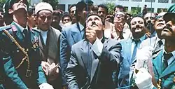 Mikhail Gorbachev had led the country as General Secretary of the Communist Party of the Soviet Union since 1985. During this time, the Soviet Union experienced a period of economic and political stagnation, and correspondingly decreased intervention in Eastern Bloc politics. In 1987, the United States President Ronald Reagan gave a famous speech at the Brandenburg Gate, challenging Soviet General Secretary Mikhail Gorbachev to "tear down this wall" which prevented freedom of movement in Berlin. The wall had stood as an icon for the political and economic division between East and West, a division that Churchill had referred to as the "Iron Curtain". Gorbachev announced in 1988 that the Soviet Union would abandon the Brezhnev Doctrine and allow the Eastern European countries to freely determine their own internal affairs.[31] In early 1989, under a new era of Soviet policies of glasnost (openness) and perestroika (economic restructuring), and taken further by Gorbachev, the Solidarity movement took hold in Poland. Further inspired by other images of brave defiance, a wave of revolutions swept throughout the Eastern Bloc that year. In May 1989, Hungary removed their border fence. However, the dismantling of the old Hungarian border facilities did not open the borders nor were the previous strict controls removed, and the isolation by the Iron Curtain was still intact over its entire length. The opening of a border gate between Austria and Hungary at the Pan-European Picnic on 19 August 1989 then set in motion a peaceful chain reaction, at the end of which there was no longer a GDR and the Eastern Bloc had disintegrated.[3][2] Extensive advertising for the planned picnic was made by posters and flyers among the GDR holidaymakers in Hungary. The Austrian branch of the Paneuropean Union, which was then headed by Karl von Habsburg, distributed thousands of brochures inviting them to a picnic near the border at Sopron. It was the largest escape movement from East Germany since the Berlin Wall had been built in 1961. After the picnic, which was based on an idea of Karl's father Otto von Habsburg to test the reaction of the USSR and Mikhail Gorbachev to an opening of the border, tens of thousands of media-informed East Germans set off for Hungary.[32] The media reaction of Erich Honecker in the "Daily Mirror" of 19 August 1989 showed the public in East and West that the Eastern European communist rulers had suffered a loss of power in their own sphere, and that they were no longer in control of events: "Habsburg distributed leaflets far into Poland, in which the East German holidaymakers were invited to a picnic. When they came to the picnic, they were given gifts, food and Deutsche Marks, and then they were persuaded to come to the West." In particular, Habsburg and the Hungarian Minister of State Imre Pozsgay considered whether Moscow would command the Soviet troops stationed in Hungary to intervene.[33] But, with the mass exodus at the Pan-European Picnic, the subsequent hesitant behavior of the Socialist Unity Party of East Germany and the nonintervention of the Soviet Union broke the dams. Thus, the bracket of the Eastern Bloc was broken.[34]