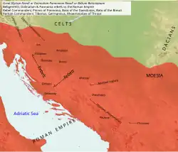 Roman forces took the initiative in AD 9, and pushed into Dalmatia. Tiberius divided his forces into three divisions: one under Silvanus, which advanced south-east from Sirmium; another commanded by Lepidus, which advanced north-west along the Una Valley from Siscia toward Burnum; and the third led by Tiberius and Germanicus in the Dalmatian hinterland. The divisions under Lepidus and Silvanus practically exterminated the Perustae and Daesitiate in their mountain strongholds.[18] Roman forces captured many cities, and those commanded by Germanicus took Raetinum, near Seretium (although it was destroyed in a fire set by the rebels during the siege), Splonum (in modern-day northern Montenegro) and Seretium itself (in modern-day western Bosnia). The Roman forces under Tiberius and Germanicus pursued Bato to the fortress of Andretium near Salona, to which they laid siege. When it became clear Bato would not surrender, Tiberius assaulted the fortress and captured him. While Tiberius negotiated the terms of surrender, Germanicus was sent on a punitive expedition across the surrounding territory, during which he forced the surrender of the fortified town of Arduba and surrounding towns. He then sent a deputy to subdue the remaining districts and returned to Tiberius.[19][20]