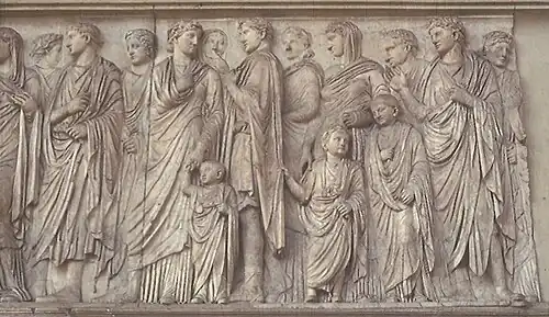 Ara Pacis: processional frieze showing members of the Imperial household (south face). Germanicus is the toddler holding Antonia Minor's hand.