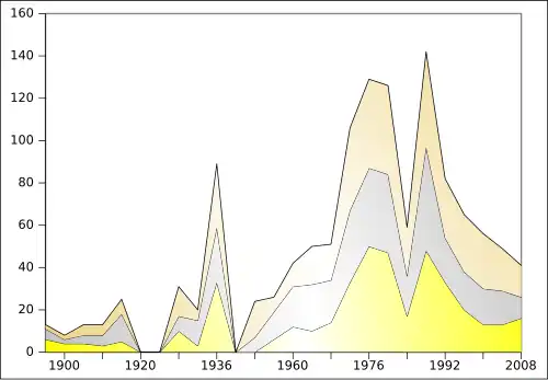 | Totals (13 entries) | 106 | 98 | 65 | 269 |