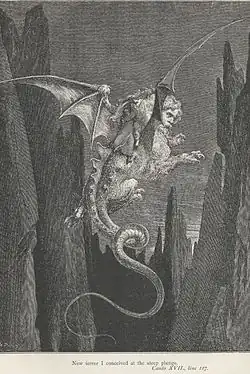 The Geryon of Dante's 14th century epic poem Inferno bears no resemblance to any previous writings. Here, Geryon has become the Monster of Fraud, a beast with the paws of a bear or lion, the body of a wyvern, and a scorpion's poisonous sting at the tip of his tail, but with the face of an "honest man" (similar to a manticore). He dwells somewhere in the shadowed depths below the cliff between the seventh and eighth circles of Hell (the circles of violence and simple fraud, respectively); Geryon rises from the pit at Virgil's call and to Dante's horror Virgil requests a ride on the creature's back. They then board him, and Geryon slowly glides in descending circles around the waterfall of the river Phlegethon down to the great depths to the Circle of Fraud.[7]