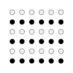 The law of similarity states that elements within an assortment of objects are perceptually grouped together if they are similar to each other in shape, colour, size etc. For example, the figure illustrating the law of similarity portrays 36 circles all equal distance apart from one another forming a square. In this depiction, 18 of the circles are shaded dark, and 18 of the circles are shaded light. We perceive the dark circles as grouped together and the light circles as grouped together, forming six horizontal lines within the square of circles. This perception of lines is due to the law of similarity.[37]