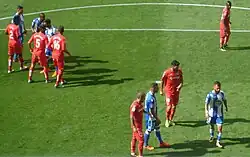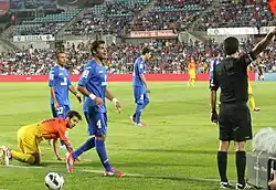 The following season, coach Bernd Schuster left after two seasons to become head coach at Real Madrid,[22] and Getafe appointed Michael Laudrup as his replacement.[23] Under Laudrup, Getafe again finished the league mid-table. In the UEFA Cup, the team managed to progress to the quarter-finals after finishing top of Group G, only losing once,[24] setting up a tie against four-time European Cup winners Bayern Munich. Getafe drew the away leg 1–1,[25] thanks to an injury time equaliser from Cosmin Contra. In the second leg, Rubén de la Red was sent off after six minutes. Contra put Getafe ahead just before half-time, but in the 89th minute, Franck Ribéry equalized to send the match into extra time. Two quick goals from Javier Casquero and substitute Braulio gave Getafe a 3–1 lead, but Bayern pulled a goal back from Luca Toni, before Toni again scored seconds before the end of extra time, giving Bayern an away goals win.[26] Getafe also had successful run in the Copa del Rey, reaching the final for a second year running. In the final, at the Vicente Calderón Stadium, Getafe were beaten 3–1 by Valencia.[27]