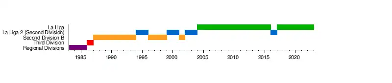 Starting in the regional leagues in 1983–84, Getafe was promoted for four consecutive seasons until reaching the Segunda División B. The club started a new period with its promotion into Segunda in 1994–95, staying only two years.[6] Threatening absolute disappearance just a few years later in 1997, Getafe survived relegation into the fourth level Tercera División following a two-legged playoff victory over Huesca.