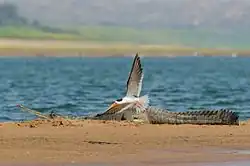 The name 'gharial' is derived from the Hindustani word 'ghara' for an earthen pot, in reference to the nasal protuberance on the adult male's snout. It is also called 'gavial'.[4] The name 'fish-eating crocodile' is a translation of its Bengali name 'mecho kumhir', with 'mecho' being derived from 'māch' meaning fish and 'kumhir' meaning crocodile.[5] The name 'Indian gharial' has occasionally been used for gharial populations in India.[6]