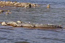 The gharial once thrived in all the major river systems of the northern Indian subcontinent, from the Indus River in Pakistan, the Ganges in India, the Brahmaputra River in northeastern India and Bangladesh to the Irrawaddy River in Myanmar.[39] In the early 20th century, it was considered common in the Indus River and its Punjabi tributaries.[49][50] By the early 1980s, it was almost extinct in the Indus.[42] During surveys in 2008 and 2009, no gharial was sighted in the river.[4] It was also present in India's Godavari River but was hunted to extinction between the late 1940s and the 1960s.[51] It was considered extinct in the Koshi River since 1970.[52] In the 1940s, it was numerous in the Barak River in Assam, which held big fish at the time including golden mahseer (Tor putitora).[53] A few individuals were also sighted in tributaries of the Barak River in Assam, Mizoram and Manipur up to 1988, but surveys were not carried out.[54] In 1927, a gharial was shot in the Shweli River in Myanmar, a tributary of the Ayeyawady River.[55] This is the only authenticated record in the country attesting the survival of gharials into the 20th century. Whether gharials still live in the Shweli River today is possible but remained unclear in 2012.[30]