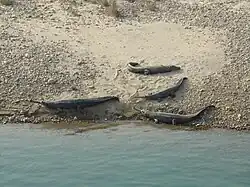 • Girwa River in Katarniaghat Wildlife Sanctuary where the small breeding population was reinforced with captive reared gharials since 1979.[65] A total of 909 gharials were released until 2006, but only 16 nesting females were recorded in the same year.[2] In December 2008, 105 individuals were counted, including 35 adults. In spring 2009, 27 nests were detected in seven sites.[66] The number of nest sites decreased from seven in 2017 to two in 2019, possibly due to the upgrowth of woody vegetation and reduced river flow near sandbanks.[67]