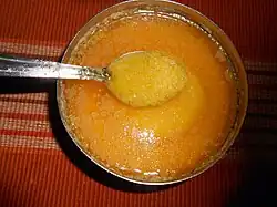 Ghee (Hindi: घी) is a type of clarified butter, originating from India.[3] It is commonly used for cooking, as a traditional medicine, and for Hindu religious rituals.[4]