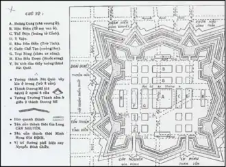 Following the recapture of Saigon, Nguyễn Ánh consolidated his power base and prepared the destruction of the Tây Sơn. His enemies had regularly raided the south and looted the annual rice harvests, so Nguyễn Ánh was keen to strengthen his defence. One of Nguyễn Ánh's first actions was to ask the French officers to design and supervise the construction of a modern European-style citadel in Saigon. The citadel was designed by Theodore Lebrun and de Puymanel, with 30,000 people mobilized for its construction in 1790.[66] The townsfolk and the mandarins were punitively taxed for the work and the laborers were so over-worked that they revolted. When finished, the stone citadel had a perimeter measuring 4,176 meters in a Vauban model.[66] The fortress was bordered on three sides by pre-existing waterways, bolstering its natural defensive capability.[67] Following the construction of the citadel, the Tây Sơn never again attempted to sail down the Saigon River and try to recapture the city, its presence having endowed Nguyễn Ánh with a substantial psychological advantage over his opponents.[68] Nguyễn Ánh took a keen personal interest in fortifications, ordering his French advisors to travel home and bring back books with the latest scientific and technical studies on the subject.[69] The Nguyễn royal palace was built inside the citadel.[70]