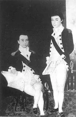 Deflated by his situation, Nguyễn Ánh asked Pigneau to appeal for French aid, and allowed Pigneau to take his son Nguyễn Phúc Cảnh with him as a sign of good faith.[25][31][39] This came about after Nguyễn Ánh had considered enlisting assistance from the British, Dutch, Portuguese and Spanish.[40] Pigneau advised against Nguyễn Ánh's original plan to seek Dutch aid from Batavia, fearing that the support of the Protestant Dutch would hinder the advancement of Catholicism.[25] Pigneau left Vietnam in December,[31] arriving in Pondicherry, India in February 1785 with Nguyễn Ánh's royal seal. Nguyễn Ánh had authorized him to make concessions to France in return for military assistance.[41] The French administration in Pondicherry, led by acting governor Coutenceau des Algrains, was conservative in outlook and resolutely opposed intervention in southern Vietnam.[41][42] To compound the already complex situation, Pigneau was denounced by Spanish Franciscans in the Vatican, and he sought to transfer his political mandate to Portuguese forces. The Portuguese had earlier offered Nguyễn Ánh 56 ships to use against the Tây Sơn.[43]