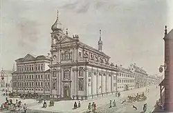 In 1752, his brother Francesco and he moved from Paris to Dresden, where his mother and sister Maria Maddalena were living. His new play, La Moluccheide, now lost, was performed at the Royal Theatre, where his mother often played in lead roles.[46][47] He then visited Prague, and Vienna, where the tighter moral atmosphere was not to his liking. He finally returned to Venice in 1753.[48] There, Casanova resumed his escapades, picking up many enemies and gaining the scrutiny of the Venetian inquisitors. His police record became a lengthening list of reported blasphemies, seductions, fights, and public controversy.[49] A state spy, Giovanni Manucci, was employed to draw out Casanova's knowledge of cabalism and Freemasonry and to examine his library for forbidden books. Senator Bragadin, in total seriousness this time (being a former inquisitor himself), advised his "son" to leave immediately or face the stiffest consequences.