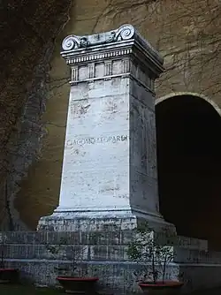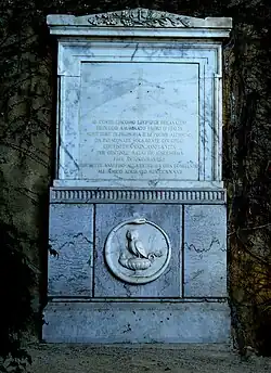 Leopardi died in Naples during the cholera epidemic of 1837, the immediate cause probably being pulmonary edema or heart failure, due to his fragile physical condition. Thanks to Antonio Ranieri's intervention with the authorities, Leopardi's remains were not buried in a common grave (as the strict hygiene regulations of the time required), but in the atrium of the Church of San Vitale at Fuorigrotta. In 1898 his tomb was moved to the Parco Virgiliano and declared a national monument.[17][18]