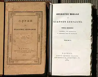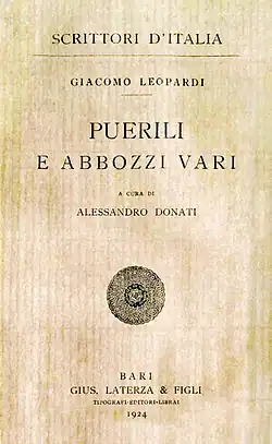 - ^ "Crestomazia italiana poetica, cioè scelta di luoghi in verso italiano insigni o per sentimento o per locuzione, raccolti, e distribuiti secondo i tempi degli autori dal conte Giacomo Leopardi by LEOPARDI, Giacomo (1798-1837): Molto buono (Very Good) (1828) | Libreria Alberto Govi di F. Govi Sas". www.abebooks.com. Retrieved 14 October 2021.
