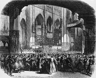 Meyerbeer's large choral 'tableaux' also made a major contribution to the overall dramatic effect; the composer particularly sought opportunities to write such large-scale crowd scenes, and preferred libretti which offered such possibilities.[85] Crosten writes: 'These massive developed sections are the chief glory of the Meyerbeerian opera, for they are not only big in volume but big in their structural design'.[90]