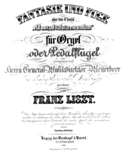 Themes from Meyerbeer's works were used by many contemporary composers, often in the form of keyboard paraphrases or fantasies. Perhaps the most elaborate and substantial of these is Franz Liszt's monumental Fantasy and Fugue on the chorale "Ad nos, ad salutarem undam", S. 259 (1852), for organ or pédalier, based on the chorale of the Anabaptist priests in Le prophète and dedicated to Meyerbeer.[98] The work was also published in a version for piano duet (S. 624) which was much later arranged for solo piano by Ferruccio Busoni.