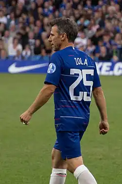 Zola was voted as the best ever Chelsea player by Chelsea's fans in early 2003.[6] In November 2004, he was awarded an OBE, Honorary Member of the Order of the British Empire in a special ceremony in Rome.[4] In 2005, Zola was voted into the Chelsea F.C. Centenary Eleven, occupying one of the two forward roles. No Chelsea player held Zola's number 25 shirt since his departure in 2003 until the number was given to Moisés Caicedo 20 years later in 2023 after he contacted Zola for permission to wear the shirt.[31] Zola was also voted by The Sun one of the top ten best foreign "artistic" players in Premier League history in 2007, coming in second place behind George Best.[32]