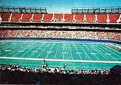 The stadium's maximum seating capacity was 80,242.[3] The structure was 756 feet (230 m) long, 592 feet (180 m) wide and 144 feet (44 m) high from service level to the top of the seating bowl and 178 feet (54 m) high to the top of the south tower. The volume of the stadium was 64.5 million cubic feet (1,830,000 m3), and 13,500 tons of structural steel were used in the building process while 29,200 tons of concrete were poured.[4] It was owned and operated by the New Jersey Sports and Exposition Authority (NJSEA). The stadium's field was aligned northwest to southeast, with the press box along the southwest sideline.