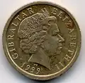 In 1988, coins in denominations of 1, 2, 5, 10, 20 and 50 pence and 1 pound were introduced which bore specific designs for and the name of Gibraltar. They were the same sizes and compositions as the corresponding British coins, with 2-pound coins introduced in 1999. A new coin of 5 pounds was issued in 2010 with the inscription "Elizabeth II · Queen of Gibraltar".[7] This issue caused controversy in Spain, where the title of King of Gibraltar historically corresponds to the Crown of Castile.[8] In 2025 the Gibraltar National Mint issued the first 12-sided £1 coin, which reportedly saw high demand among collectors.[9]