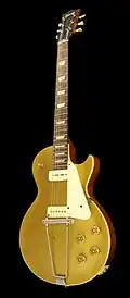 The Deluxe was among the "new" 1968–1969 Les Pauls and seen as an evolution of the Special.[32] This model featured "mini-humbuckers", also known as "New York" humbuckers, and did not initially prove popular. The mini-humbucker pickups fit into the pre-carved P-90 pickup cavity using an adaptor ring developed by Gibson in order to use a surplus supply of Epiphone mini-humbuckers.[33] The Deluxe was introduced in 1970 and helped to standardize production among Gibson's U.S.-built Les Pauls. The first incarnation of the Deluxe featured a one-piece body and slim three-piece neck (It has been thought that some of these early "one-piece" bodies were actually leftovers from original 1950s Les Paul parts). The multi-piece body (a thin layer of maple on top of two layers of Honduran mahogany) arrived later in 1969. Towards the end of that year, a reinforcing neck volute was added.[19] 1969 Deluxes feature the Gibson logo devoid of the dot over the "i" in Gibson. By late 1969/early 1970, the dot over the "i" had returned, plus a "Made In USA" stamp on the back of the headstock. Gibson produced 216 Deluxe Gold Top as specially-ordered guitars with full-size humbucker t-tops pickups between 1972 and 1974 (179 in 1973, 28 in 1974 and 9 in 1972), as a Les Paul Standard pickup specification.