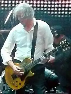 These Les Pauls were considered to be too heavy and old-fashioned, and they initially did not find favor amongst guitarists. In 1961, Gibson stopped producing the traditional Les Paul in favor of a lighter redesign which was later called the SG.[7] The mid-1960s, however, brought a resurgence of interest in the Les Paul Standard. In 1964, The Rolling Stones' Keith Richards began using a sunburst, 1959 Les Paul Standard — becoming the first "star-guitarist" to play a Les Paul on the British scene.[10][11] The guitar, outfitted with a Bigsby tailpiece, served as one of the guitarist's prominent instruments and provided the first impetus to the use of Les Pauls during the British blues boom.[12] In 1965, Eric Clapton began using Les Pauls because of the influence of Freddie King and Hubert Sumlin, and played a 1960 Standard on the groundbreaking album Blues Breakers with Eric Clapton.[13][14][15] In America, Mike Bloomfield began using a 1954 Les Paul goldtop while touring with the Paul Butterfield Blues Band, and recorded most of his work on the band's East-West album with that guitar. A year later, he traded it for a 1959 Standard with which he became most identified. By 1967, Jerry Garcia of the Grateful Dead was using mid-1950s, P-90 pickup-equipped goldtops or black custom models, which he used through 1968.[16] Concurrently in the late 1960s, artists such as Peter Green, Jeff Beck, Paul Kossoff, and Jimmy Page began using sunburst Les Paul Standards. Responding to this influence and increased pressure from the public, Gibson reintroduced the Les Paul single-cutaway guitar in July 1968, and the guitar remains in production today.
